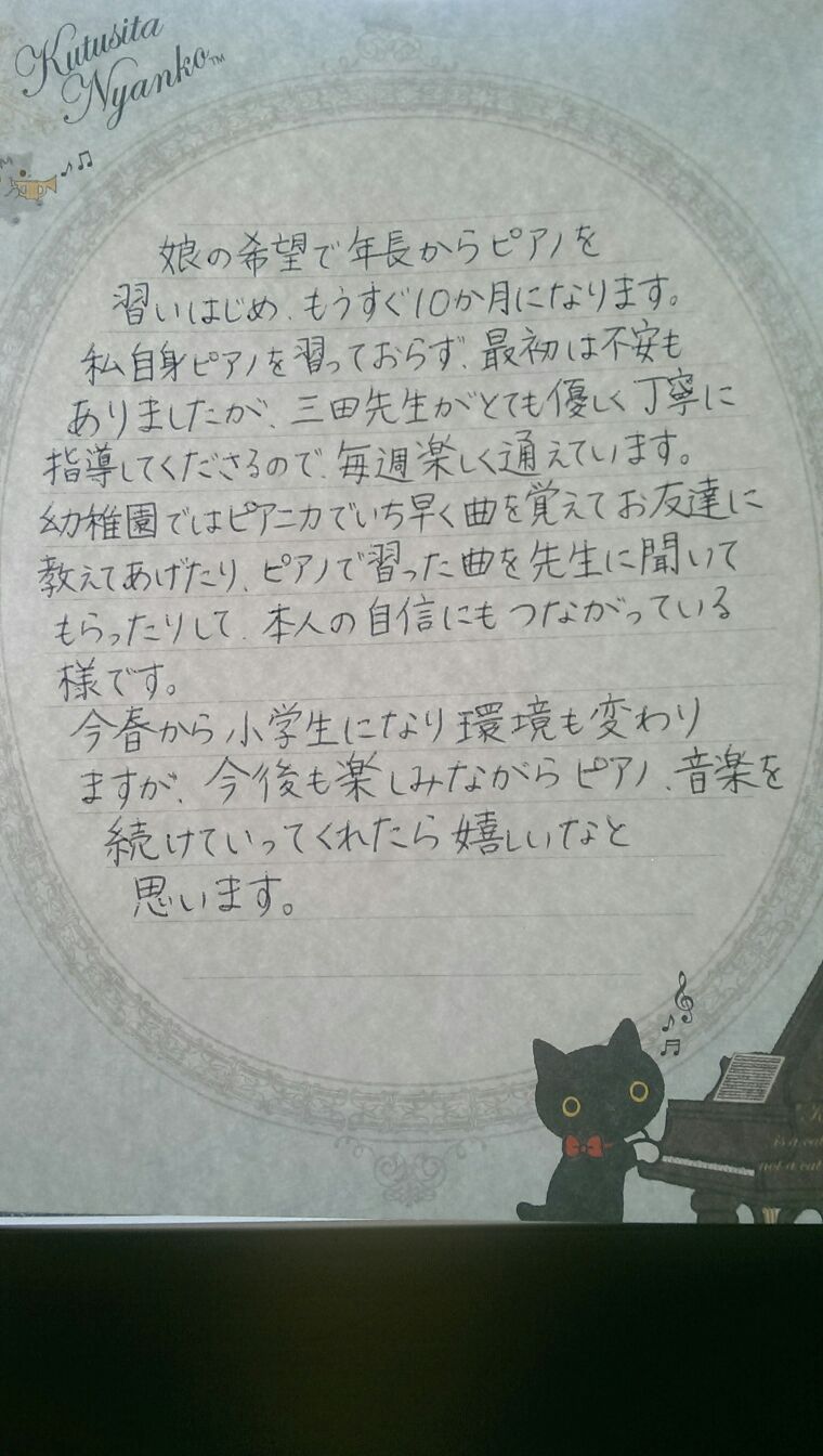 娘の希望で年長からピアノを習いはじめ、もうすぐ10か月になります。私自身ピアノをならっておらず、最初は不安もありましたが、三田先生がとても優しく丁寧に指導してくださるので毎週楽しく通えています。幼稚園ではピアニカでいち早く曲を覚えてお友達に教えてあげたりピアノで習った曲を先生に聞いてもらったりして本人の自信にもつながっている様子です。今春から小学生になり環境も変わりますが、今後も楽しみながらピアノ、音楽を続けてくれたら嬉しいなと思います。( ↓ Mちゃんお母さまより)