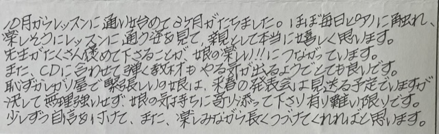 10月からレッスンに通い始めて3か月がたちました。ほぼ毎日ピアノに触れ、楽しそうにレッスンに通う娘を見て、親としては本当に嬉しく思います。先生がたくさん褒めてくださることが、娘の楽しい!!につながっています。また、CDに合わせて弾く教材もやる気が出るようでとても良いです。恥ずかしがり屋で緊張しいの娘は、来週の発表会は見送る予定でいますが決して無理強いせず、娘の気持ちに寄り添って下さり有難い限りです。少しずつ自信を付けて、また、楽しみながら長くつづけてくれればと思います( ↓ Mちゃんお母さまより)