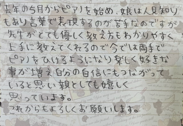 去年の5月からピアノを始め、娘は人見知りもあり言葉で表現するのが苦手なのですが先生がとても優しく教え方もわかりやすく上手に教えてくれるので今では両手でピアノを弾けるようになり楽しく好きなことが増え自分の自信にもつながっていると思い親としても嬉しく思っています。これからもよろしくお願いします。( ↓ Mちゃんのお母さまより)