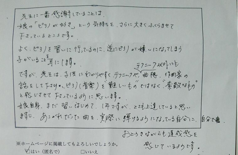 『先生に一番感謝していることは、娘の「ピアノが好き」という気持ちをさらに大きくふくらませてくださっているところです。・・・先生は子供にわかりやすく、テクニックやテクニック以外にも、曲想、作曲家の話をしてく下さり、ピアノ(音楽)を難しいものではなく、素敵なものと感じさせて下さっているように思います。娘自身、まだ習いはじめて、1年ですが、とても上達しているように思います。あこがれだった曲を実際に弾けるようになっている自分に、自分でおどろきながら達成感を感じているようにです。(Nちゃんお母さまより)