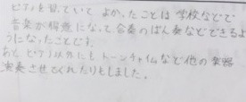 ピアノを習っていてよかったことは、学校などで音楽が得意になって、合奏の伴奏などできるようになったことです。あと、ピアノ以外にもトーンチャイムなど他の楽器演奏をさせてくれたりもしました。(↓Aちゃんより)