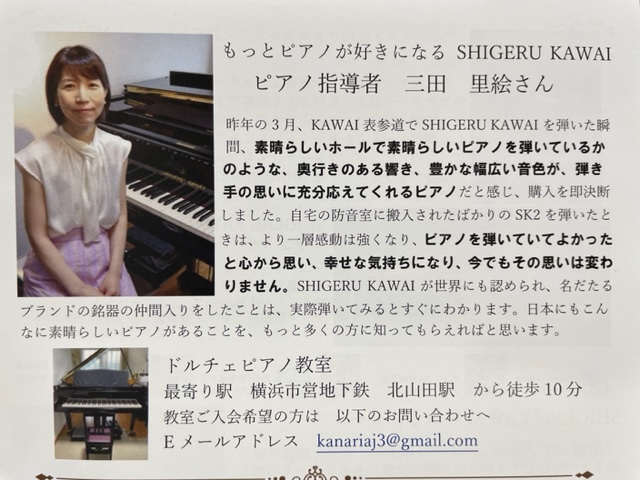 先日、SK2でお世話になっているカワイの表参道さんへ寄稿させていただいだ、Owner’s voice が発行されたので紹介させていただきますね。
